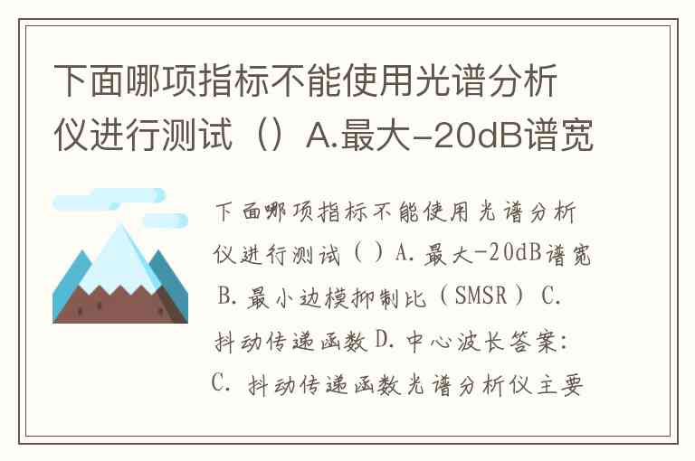 下面哪项指标不能使用光谱分析仪进行测试()A.最大-20dB谱宽 B.最小边模抑制比(SMSR) C.抖动传递函数 D.中心波长