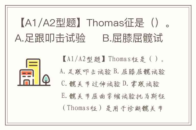 【A1/A2型题】Thomas征是()。A.足跟叩击试验 B.屈膝屈髋试验 C.髋关节过伸试验 D.掌跟试验 E.髋关节屈曲挛缩试验