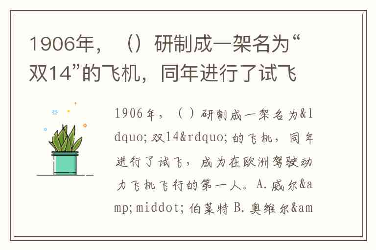 1906年,()研制成一架名为“双14”的飞机,同年进行了试飞,成为在欧洲驾驶动力飞机飞行的第一人。A.威尔·伯莱特 B.奥维尔·莱特 C.杜蒙特