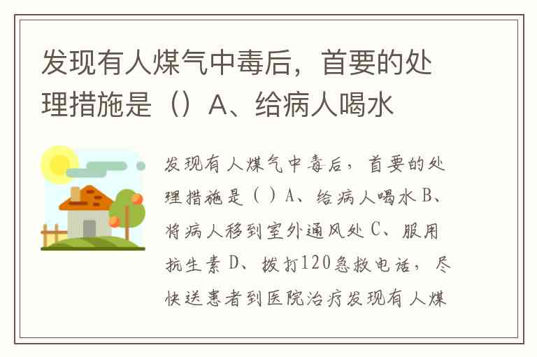 发现有人煤气中毒后,首要的处理措施是()A、给病人喝水 B、将病人移到室外通风处 C、服用抗生素 D、拨打120急救电话,尽快送患者到医院治疗