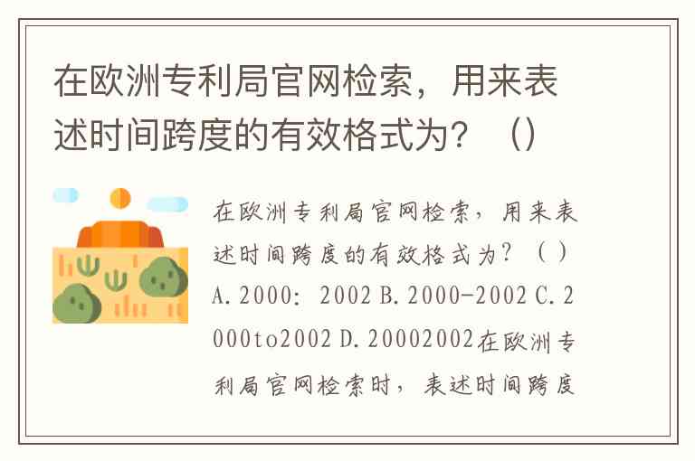 在欧洲专利局官网检索,用来表述时间跨度的有效格式为?()A.2000:2002 B.2000-2002 C.2000to2002 D.20002002