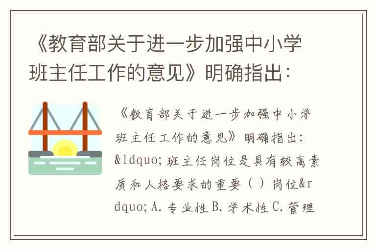 《教育部关于进一步加强中小学班主任工作的意见》明确指出:“班主任岗位是具有较高素质和人格要求的重要()岗位”A.专业性 B.学术性 C.管理性 D.教育性