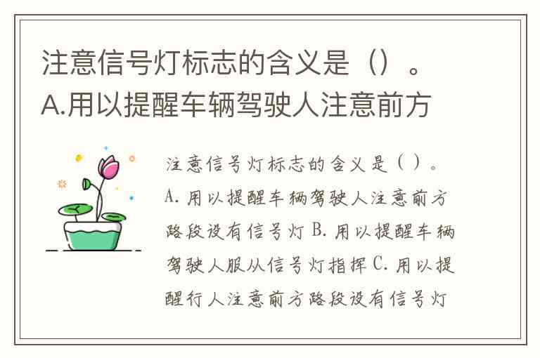 注意信号灯标志的含义是()。A.用以提醒车辆驾驶人注意前方路段设有信号灯 B.用以提醒车辆驾驶人服从信号灯指挥 C.用以提醒行人注意前方路段设有信号灯