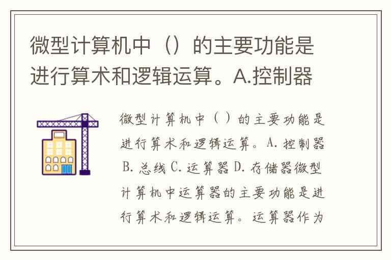 微型计算机中运算器的主要功能是进行算术和逻辑运算。运算器作为CPU(中央处理器)的核心组成部分,负责执行所有数学计算(如加减乘除)和逻辑判断(如比较、与或非等操作),是计算机处理数据的关键部件。