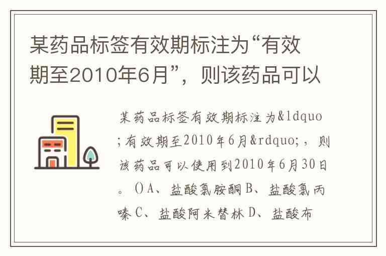 某药品标签有效期标注为“有效期至2010年6月”,则该药品可以使用到2010年6月30日。()A、盐酸氯胺酮 B、盐酸氯丙嗪 C、盐酸阿米替林 D、盐酸布比卡因 E、卡马西平