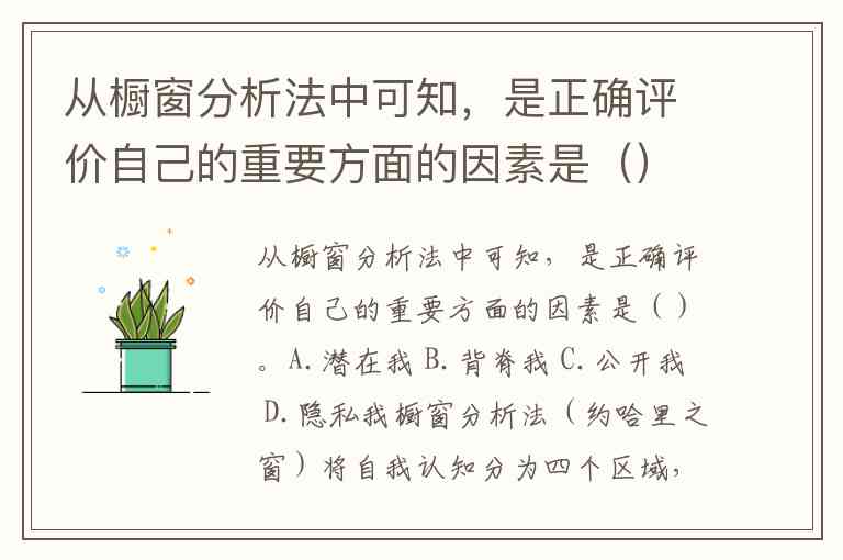 从橱窗分析法中可知,是正确评价自己的重要方面的因素是()。A.潜在我 B.背脊我 C.公开我 D.隐私我