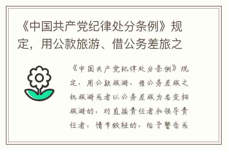 《中国共产党纪律处分条例》规定,用公款旅游、借公务差旅之机旅游或者以公务差旅为名变相旅游的,对直接责任者和领导责任者,情节较轻的,给予警告或者严重警告处分;情节较重的,给予撤销党内职务或者留党察看处分;情节严重的,给予开除党籍处分。