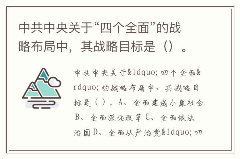 中共中央关于“四个全面”的战略布局中,其战略目标是()。A、全面建成小康社会 B、全面深化改革 C、全面依法治国 D、全面从严治党