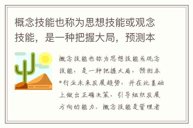 概念技能也称为思想技能或观念技能,是一种把握大局,预测本*行业未来发展趋势,并在此基础上做出正确决策、引导组织发展方向的能力。