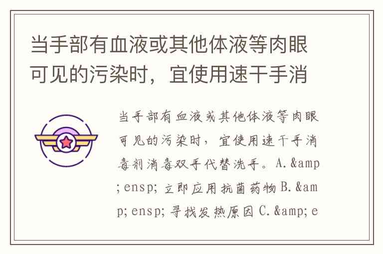 当手部有血液或其他体液等肉眼可见的污染时,宜使用速干手消毒剂消毒双手代替洗手。A. 立即应用抗菌药物 B. 寻找发热原因 C. 进行相应病原检查 D. 查清病原后再应用抗菌药物