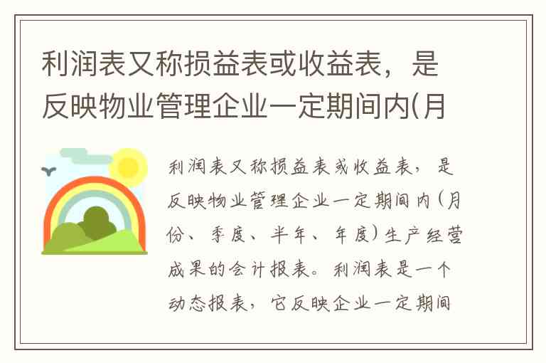 利润表又称损益表或收益表,是反映物业管理企业一定期间内(月份、季度、半年、年度)生产经营成果的会计报表。利润表是一个动态报表,它反映企业一定期间的经营成果。()