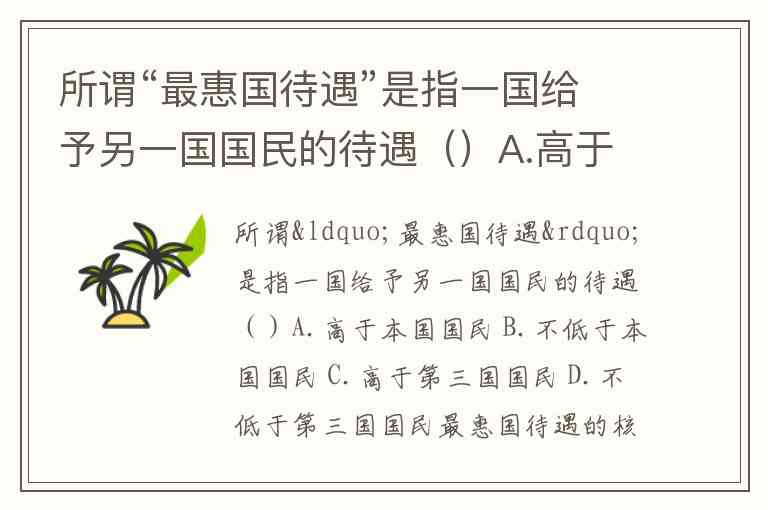 所谓“最惠国待遇”是指一国给予另一国国民的待遇()A.高于本国国民 B.不低于本国国民 C.高于第三国国民 D.不低于第三国国民