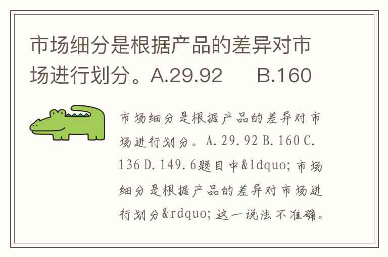 市场细分是根据产品的差异对市场进行划分。A.29.92 B.160 C.136 D.149.6