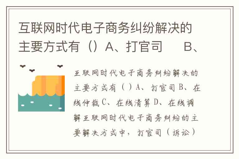 互联网时代电子商务纠纷的主要解决方式中,打官司(诉讼)、在线仲裁和在线调解均为法定或实践中广泛应用的途径,而“在线清算”并非标准法律术语或主流解决方式。以下结合具体法律实践和技术应用展开分析: