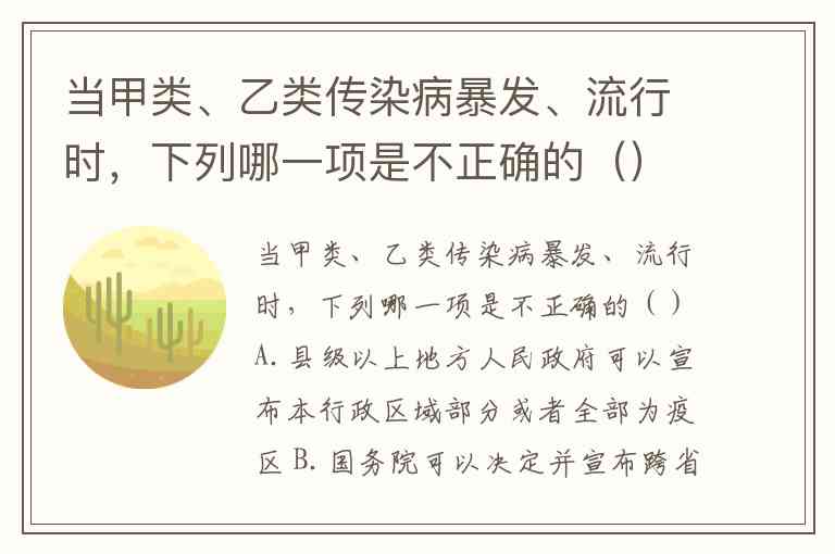 当甲类、乙类传染病暴发、流行时,下列哪一项是不正确的()A.县级以上地方人民政府可以宣布本行政区域部分或者全部为疫区 B.国务院可以决定并宣布跨省、自治区、直辖市的疫区 C.省级人民政府可以决定对本行政区域内的甲类传染病疫区实施封锁 D.省级人民政府可以决定封锁本区域内大、中城市的疫区 E.国务院决定封锁大、中城市的疫区