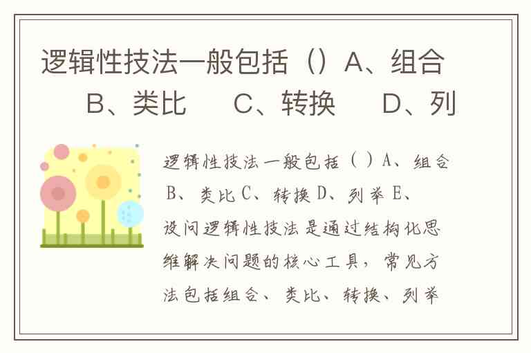 逻辑性技法是通过结构化思维解决问题的核心工具,常见方法包括组合、类比、转换、列举和设问。这些技法在科学研究、创新设计和日常决策中广泛应用,其底层逻辑基于对事物属性的拆解、关联与重构。