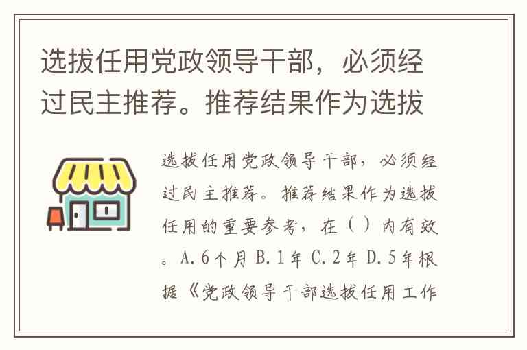 选拔任用党政领导干部,必须经过民主推荐。推荐结果作为选拔任用的重要参考,在()内有效。A.6个月 B.1年 C.2年 D.5年