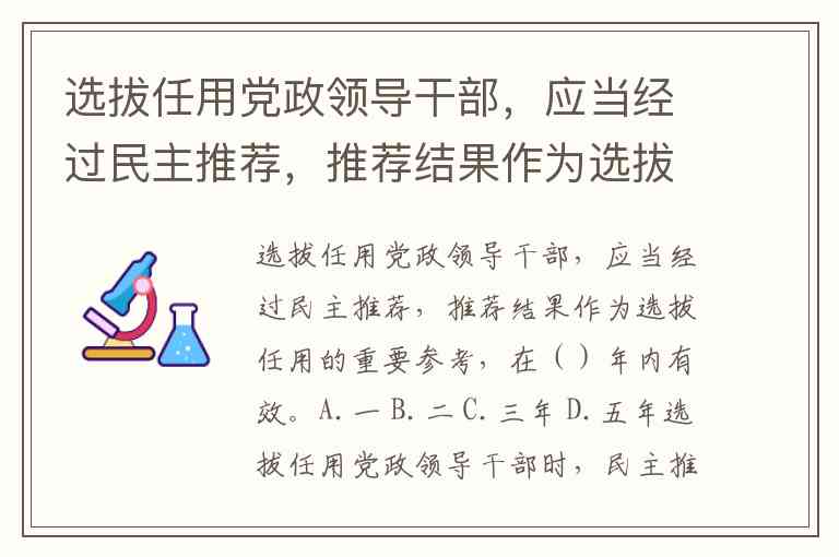 选拔任用党政领导干部,应当经过民主推荐,推荐结果作为选拔任用的重要参考,在()年内有效。A.一 B.二 C.三年 D.五年
