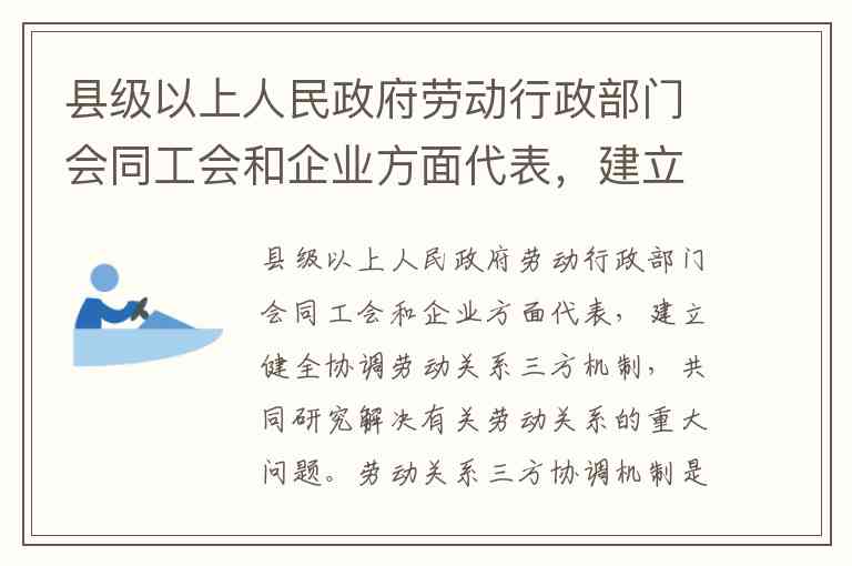 县级以上人民政府劳动行政部门会同工会和企业方面代表,建立健全协调劳动关系三方机制,共同研究解决有关劳动关系的重大问题。