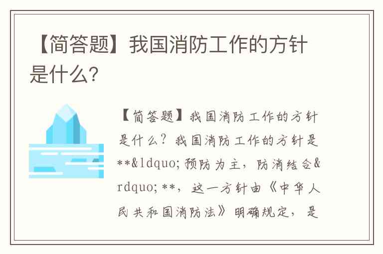 我国消防工作的方针是**“预防为主,防消结合”**,这一方针由《中华人民共和国消防法》明确规定,是贯穿火灾防控全过程的核心指导原则。