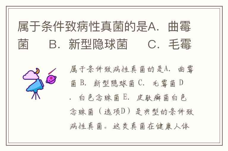 属于条件致病性真菌的是A.曲霉菌 B.新型隐球菌 C.毛霉菌 D.白色念珠菌 E.皮肤癣菌