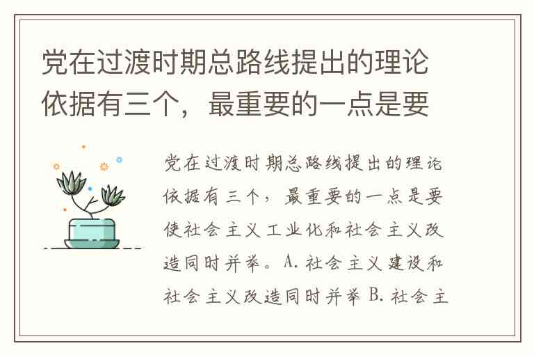 党在过渡时期总路线提出的理论依据有三个,最重要的一点是要使社会主义工业化和社会主义改造同时并举。A.社会主义建设和社会主义改造同时并举 B.社会主义工业化和社会主义改造同时并举 C.发展生产力和改变生产关系同时并举 D.改变经济基础和巩固上层建筑并举