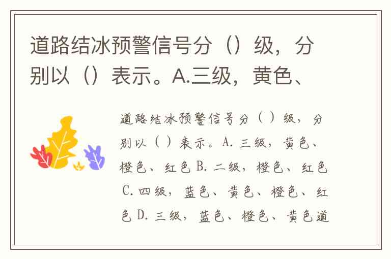道路结冰预警信号分()级,分别以()表示。A.三级,黄色、橙色、红色 B.二级,橙色、红色 C.四级,蓝色、黄色、橙色、红色 D.三级,蓝色、橙色、黄色