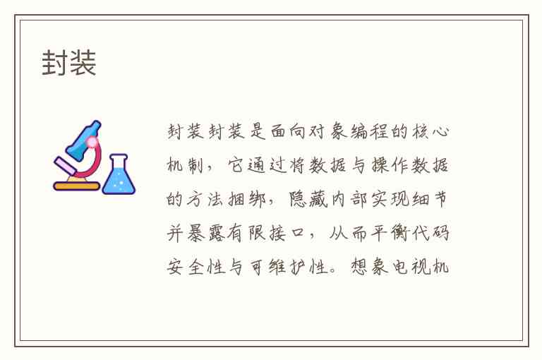 封装是面向对象编程的核心机制,它通过将数据与操作数据的方法捆绑,隐藏内部实现细节并暴露有限接口,从而平衡代码安全性与可维护性。想象电视机的设计:用户只需通过遥控器(接口)操作,无需了解电路板构造——这正是封装的现实映射,既保护内部元件(数据安全),又简化使用流程(降低复杂度)。