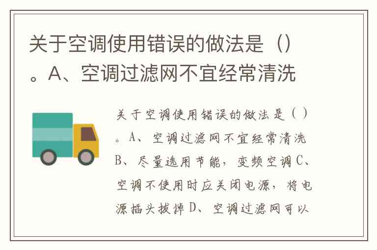 关于空调使用错误的做法是()。A、空调过滤网不宜经常清洗 B、尽量选用节能,变频空调 C、空调不使用时应关闭电源,将电源插头拔掉 D、空调过滤网可以清洗