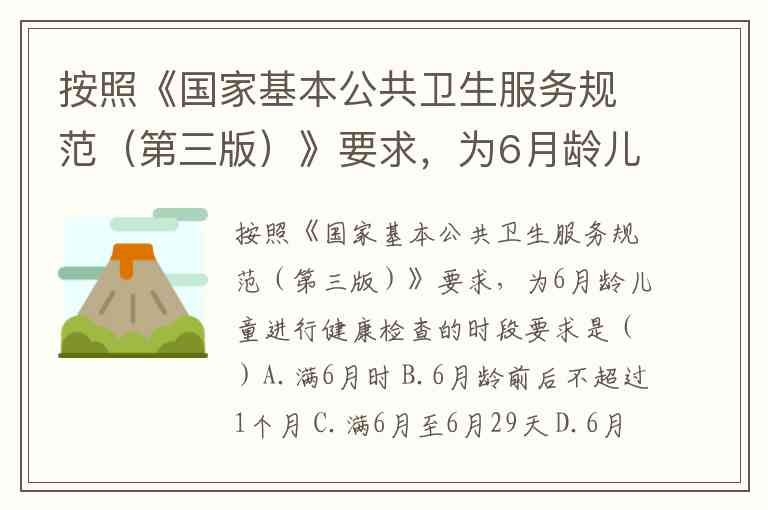 《国家基本公共卫生服务规范(第三版)》对6月龄儿童健康检查的时段要求存在明确界定。根据规范解释,“月龄”被定义为一个时间段而非特定日期,例如12月龄明确为“满12月至12月29天”,这一规则可类推至其他月龄检查。这一表述直接对应选项C“满6月至6月29天”,强调检查需在婴儿年满6个月后的当月内完成,而非前后延展的时间段。