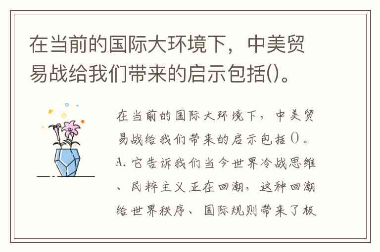在当前的国际大环境下,中美贸易战给我们带来的启示包括()。A.它告诉我们当今世界冷战思维、民粹主义正在回潮,这种回潮给世界秩序、国际规则带来了极大的挑战 B.中美之间的贸易战不是简单的贸易上的加减乘除,不仅仅是能用贸易顺差和逆差来计算得失的,而是道德之战、道路之战、理念之战、规则之战和人类命运之战 C.中美之间贸易战既是遭遇战,也是持久战,时间在中国一边,中国人顿悟的能力会成为中国在新时代实现跨越式发展的新动力 D.任何国家都不可能靠打压其他国家永远保持第一,靠遏制别人发展保持第一终将失去第一