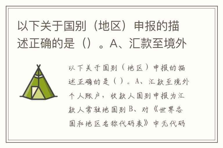 当境内居民向境外个人账户汇款时,需区分对方是境外居民还是非居民。根据“居民特例”原则,若收款人为境外居民(如中国公民在香港的账户),国别应申报为其境外账户开户银行所在国家或地区(如香港);若收款人为境外非居民,则按普适原则申报为其常驻国家或地区。选项D“收款人国别申报为境外个人账户所在地国别” 符合这一特例场景,而选项A将收款人国别错误认定为“汇款人常驻地”,因此D正确,A错误。