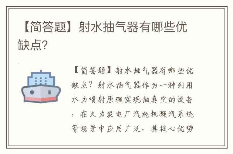 射水抽气器作为一种利用水力喷射原理实现抽真空的设备,在火力发电厂汽轮机凝汽系统等场景中应用广泛,其核心优势在于结构简洁与高效节能的平衡,同时也受限于对工作介质的依赖。