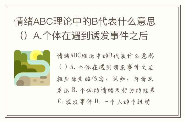 情绪ABC理论中的B代表什么意思()A.个体在遇到诱发事件之后相应而生的信念、认知、评价及看法 B.个体的情绪及行为的结果 C.诱发事件 D.一个人的个性特征
