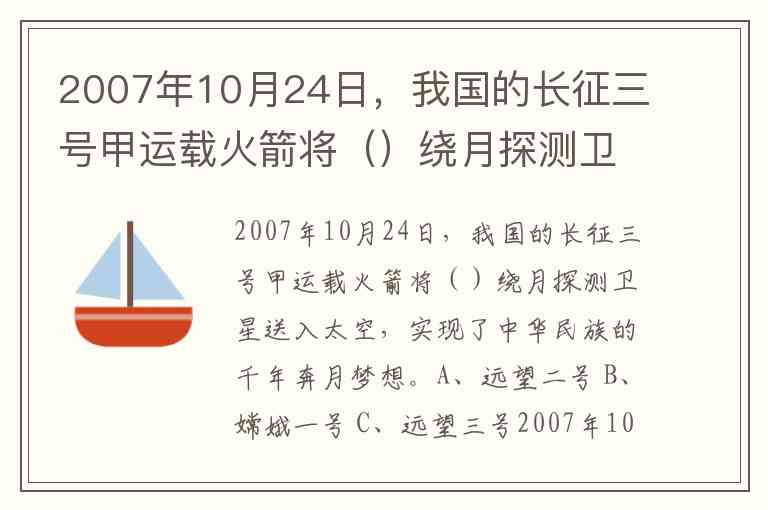 2007年10月24日,我国长征三号甲运载火箭将嫦娥一号绕月探测卫星送入太空,实现了中华民族的千年奔月梦想。这颗以中国古代神话人物命名的卫星,由中国空间技术研究院研制,是中国探月工程的开篇之作,主要任务包括获取月球表面三维影像、分析月球表面物质元素分布、探测月壤厚度及地月空间环境等。