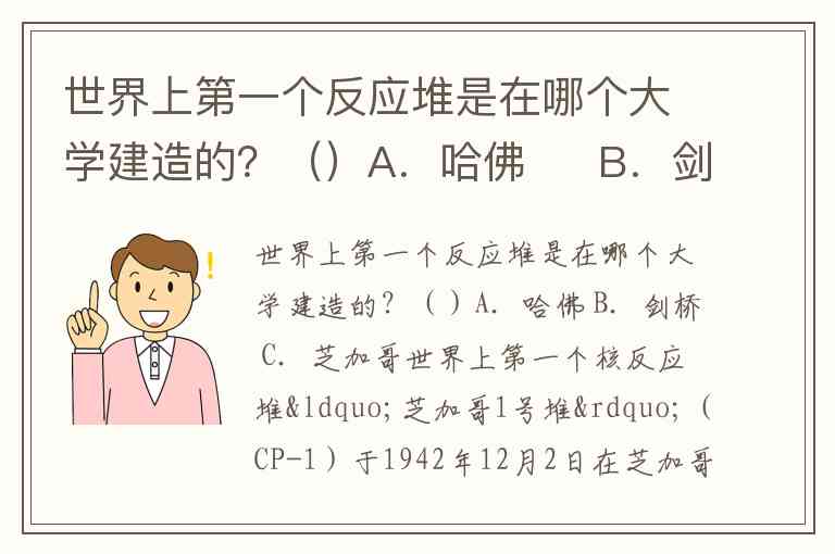 世界上第一个反应堆是在哪个大学建造的?()A.哈佛 B.剑桥 C.芝加哥