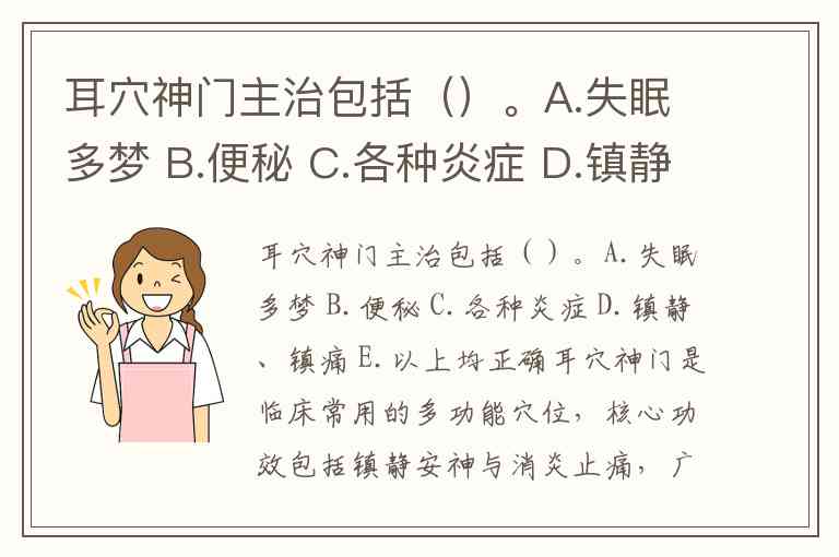 耳穴神门是临床常用的多功能穴位,核心功效包括镇静安神与消炎止痛,广泛应用于神志疾病、痛症及炎症性疾病。根据多项临床研究,其主治范围覆盖失眠多梦、各类痛症及炎症,因此选项A、C、D均正确,而便秘未被文献提及为其主治范畴。