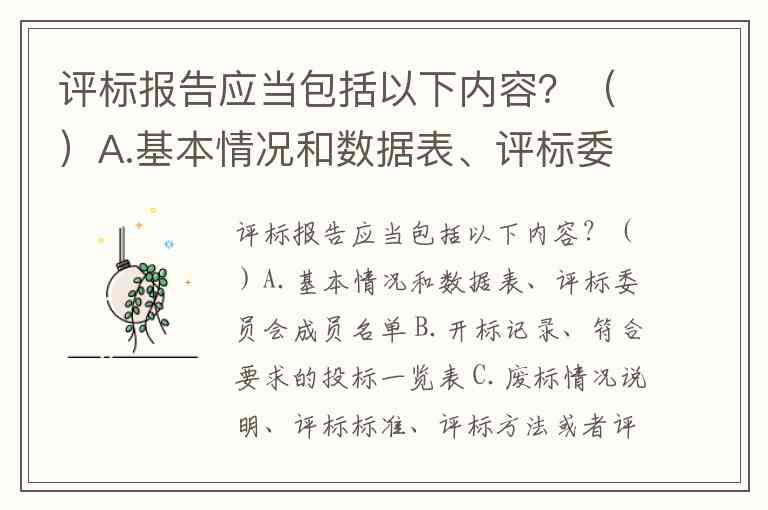 评标报告作为招投标活动的核心文件,需系统呈现评标全过程与结果。根据《评标委员会和评标方法暂行规定》及政府采购相关法规,其内容应覆盖从基础信息到最终决策的完整链条,所有选项均符合法定要求。