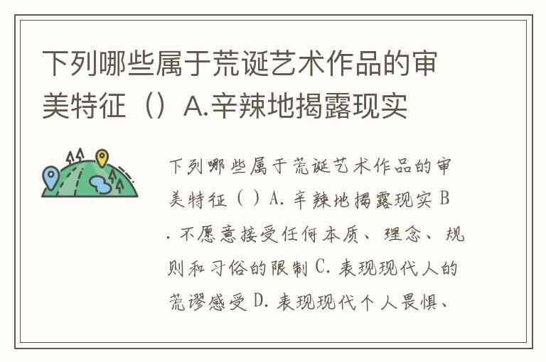 荒诞艺术的审美特征根植于对现代人生存困境的哲学反思,其核心在于通过非理性形式揭示存在的本质矛盾。从卡夫卡《变形记》的甲虫异化到贝克特《等待戈多》的虚无等待,这些作品共同构成了对传统价值体系的颠覆性审美表达。以下选项均符合荒诞艺术的审美特质: