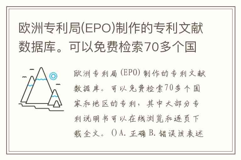 欧洲专利局(EPO)制作的专利文献数据库。可以免费检索70多个国家和地区的专利,其中大部分专利说明书可以在线浏览和逐页下载全文。()A.正确 B.错误