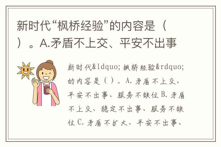新时代“枫桥经验”的内容是()。A.矛盾不上交、平安不出事、服务不缺位 B.矛盾不上交、稳定不出事、服务不缺位 C.矛盾不扩大、平安不出事、服务不缺位 D.矛盾不扩大、稳定不出事、服务不缺位