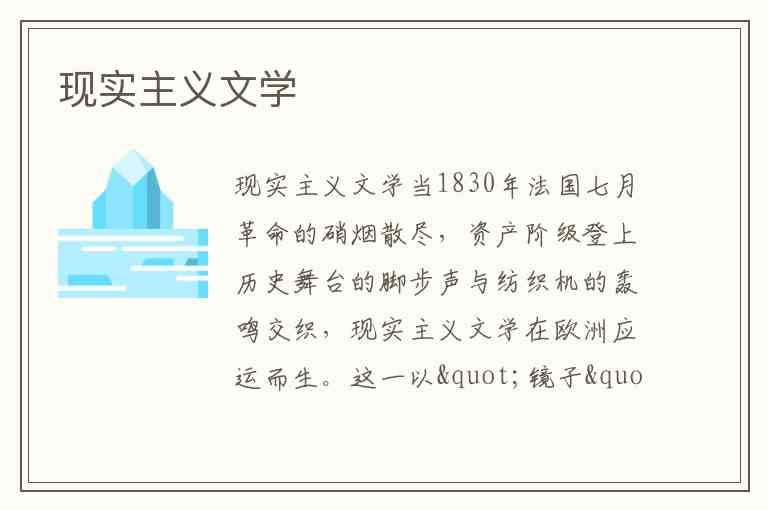 当1830年法国七月革命的硝烟散尽,资产阶级登上历史舞台的脚步声与纺织机的轰鸣交织,现实主义文学在欧洲应运而生。这一以"镜子"为隐喻的文学流派,将镜头对准资本主义上升期的社会褶皱——从巴黎公寓里高老头的最后一口气,到伦敦雾巷中孤儿奥利弗的乞食钵,再到圣彼得堡官僚办公室里"套中人"别里科夫的雨伞褶皱。恩格斯为其定下"真实地再现典型环境中的典型人物"的铁律,而巴尔扎克用96部《人间喜剧》搭建起19世纪法国的"社会实验室",连马克思都惊叹从中获得的经济细节比所有历史学家加起来还多。