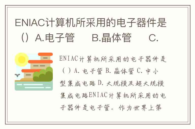 ENIAC计算机所采用的电子器件是()A.电子管 B.晶体管 C.中小型集成电路 D.大规模及超大规模集成电路