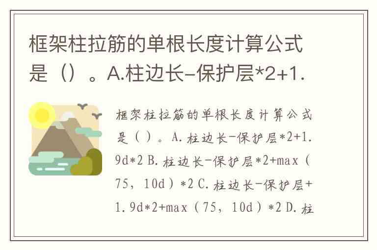 框架柱拉筋的单根长度计算公式是()。A.柱边长-保护层*2+1.9d*2 B.柱边长-保护层*2+max(75,10d)*2 C.柱边长-保护层+1.9d*2+max(75,10d)*2 D.柱边长-保护层*2+1.9d*2+max(75,10d)*2