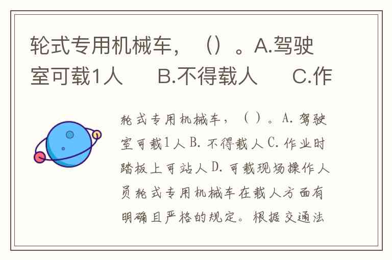 轮式专用机械车在载人方面有明确且严格的规定。根据交通法规和多个权威题库的标准答案,这类车辆不得载人,正确答案为B选项。这一规定不仅适用于驾驶室额外搭载人员,也包括禁止在作业踏板等非驾驶区域站立或乘坐人员。