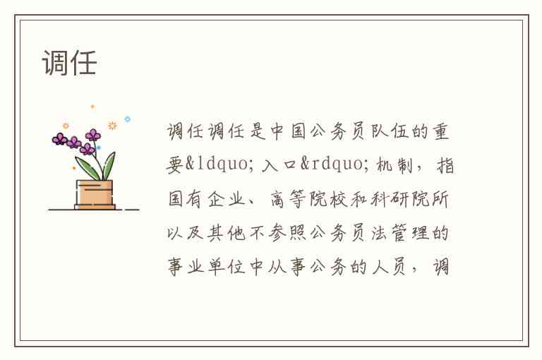 调任是中国公务员队伍的重要“入口”机制,指国有企业、高等院校和科研院所以及其他不参照公务员法管理的事业单位中从事公务的人员,调入机关担任领导职务或者四级调研员以上及其他相当层次的职级。这一制度单向打通了体制外优秀人才进入公务员队伍的通道,与公务员队伍内部的转任、培养性的挂职锻炼共同构成了公务员交流体系。