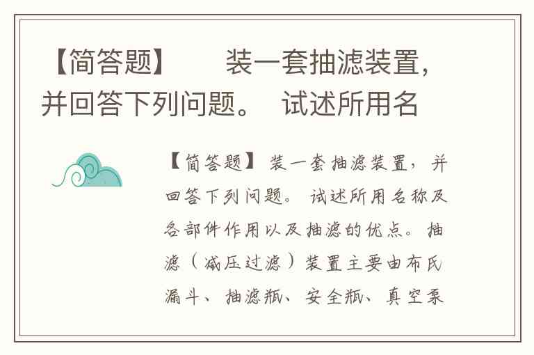 【简答题】 装一套抽滤装置,并回答下列问题。 试述所用名称及各部件作用以及抽滤的优点。