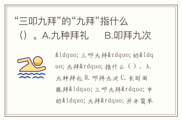 “三叩九拜”的“九拜”指什么()。A.九种拜礼 B.叩拜九次 C.长时间跪拜