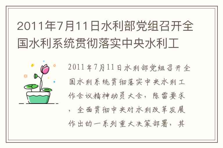 在2011年7月11日水利部党组召开的全国水利系统贯彻落实中央水利工作会议精神动员大会上,陈雷部长提出的贯彻落实中央决策部署,核心围绕三大方向展开:深刻领会中央领导讲话内涵、全面推进水利改革发展、建立健全保障机制。这一框架与此前中央一号文件对水利"公益性、基础性、战略性"的定位一脉相承,体现了从认识到行动的完整闭环。