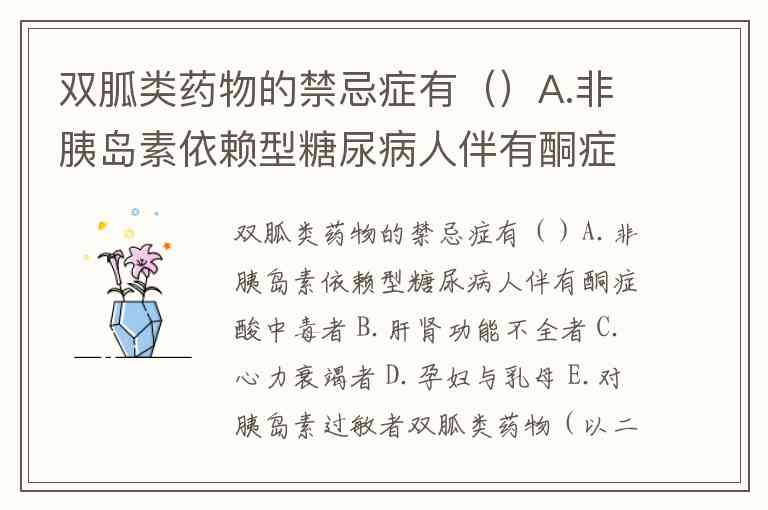 双胍类药物(以二甲双胍为代表)的禁忌症涵盖多个系统疾病状态,核心风险机制与乳酸蓄积相关。根据药品说明书及临床指南,A.非胰岛素依赖型糖尿病人伴有酮症酸中毒者、B.肝肾功能不全者、C.心力衰竭者和D.孕妇与乳母均属于明确禁忌范畴,而E.对胰岛素过敏者与双胍类药物使用无直接关联。